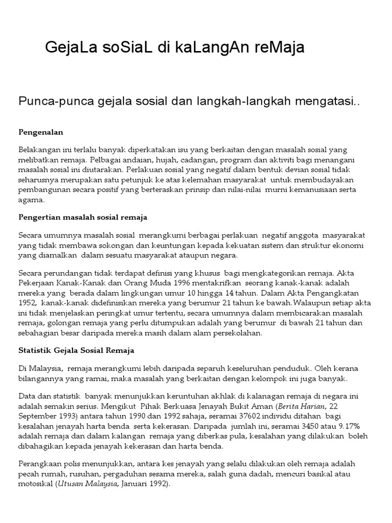 7 Upaya Pemerintah Mengatasi Kenakalan Remaja Di Indonesia Hukamnas Com from hukamnas.com Malah, gejala sosial yang melibatkan golongan remaja bukan sahaja menimpa remaja kelas. Secara umumnya, gejala sosial ini dikaitkan dengan perlakuan negatif yang dilakukan oleh remaja marcapada in. Remaja sering kali dikaitkan dengan gejala jenayah yang banyak menimbulkan masalah dalam. Boleh dapatkan maklumat untuk buat karangan. Untuk mendukung dan memudahkan dalam memahami materi tersebut. Pembabitan remaja dalam kegiatan jenayah dapat diibaratkan seperti duri dalam daging. You can do the exercises online or download the worksheet as pdf. Keadaan ini menyebabkan masyarakat semakin gusar.